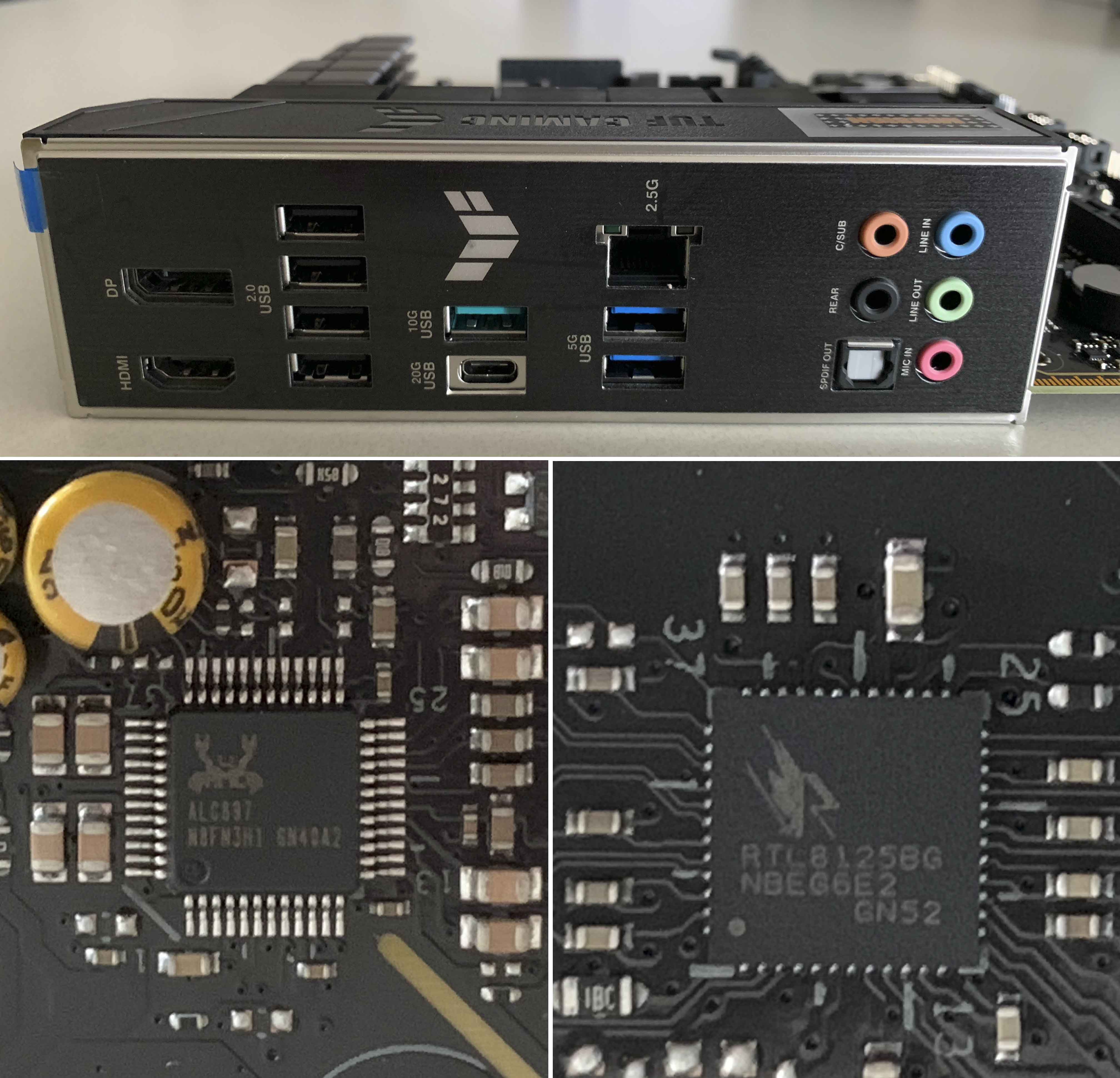 HDIM 포트, DP 포트, USB2.0 Type-A 4개(검은색), USB Type-C 20Gbps, USB Type-A 10Gbps(청록색), USB Type-A 5Gbps 2개(파란색), 2.5Gbps 랜(Realtek RTL8125BG), Optical S/PDIF 출력 단자, 오디오 포트(Realtek ALC 897 최대 24비트/192kHz 재생을 지원) 등이 있습니다.