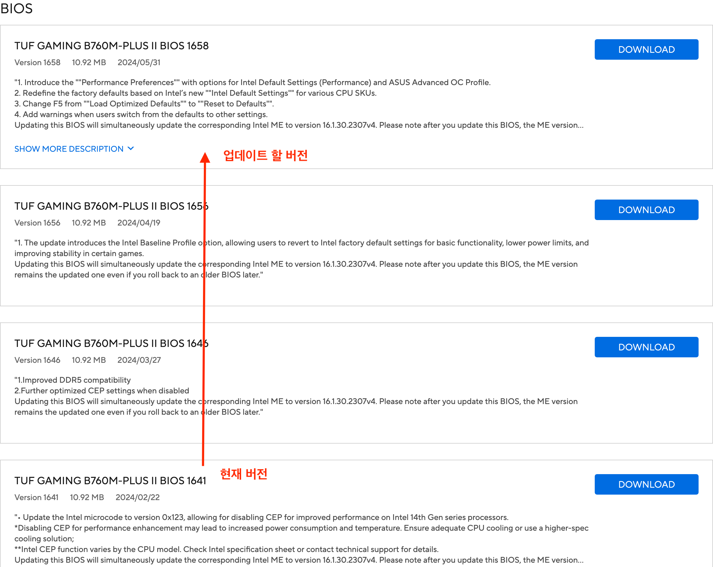 바이오스에서 1641버전(2024년 2월 22일)임을 확인하고, 공식홈페이지에서 1658버전(2024년 5월 31일)까지 지원함을 확인했습니다. FAT32로 포멧한 USB에, 다운 받은 파일을 옮긴후 바이오스 업데이트를 진행했습니다.