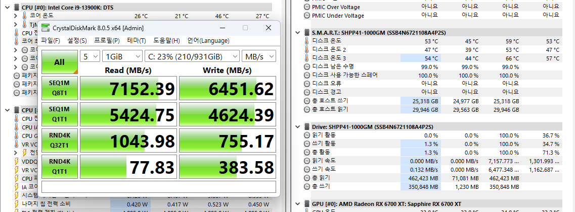 SK하이닉스 Platinum P41 1TB 제품을 대상으로 크리스탈디스크마크로 실행한 결과입니다.