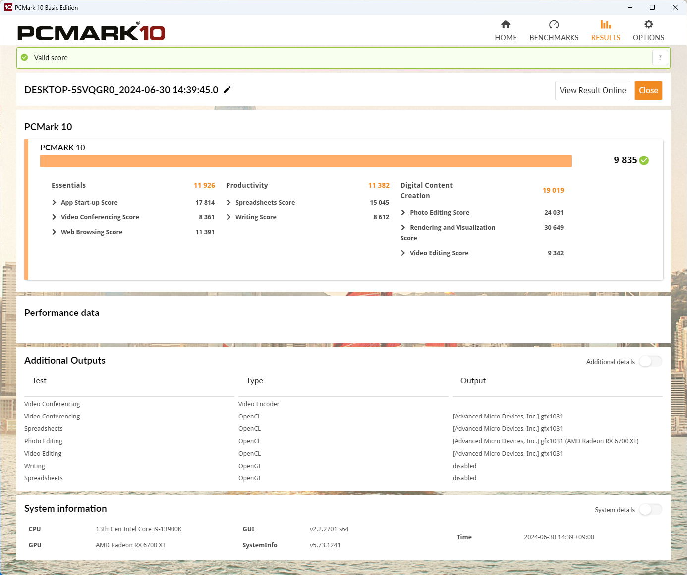PCMARK10 프로그램에서 실행한 결과입니다.