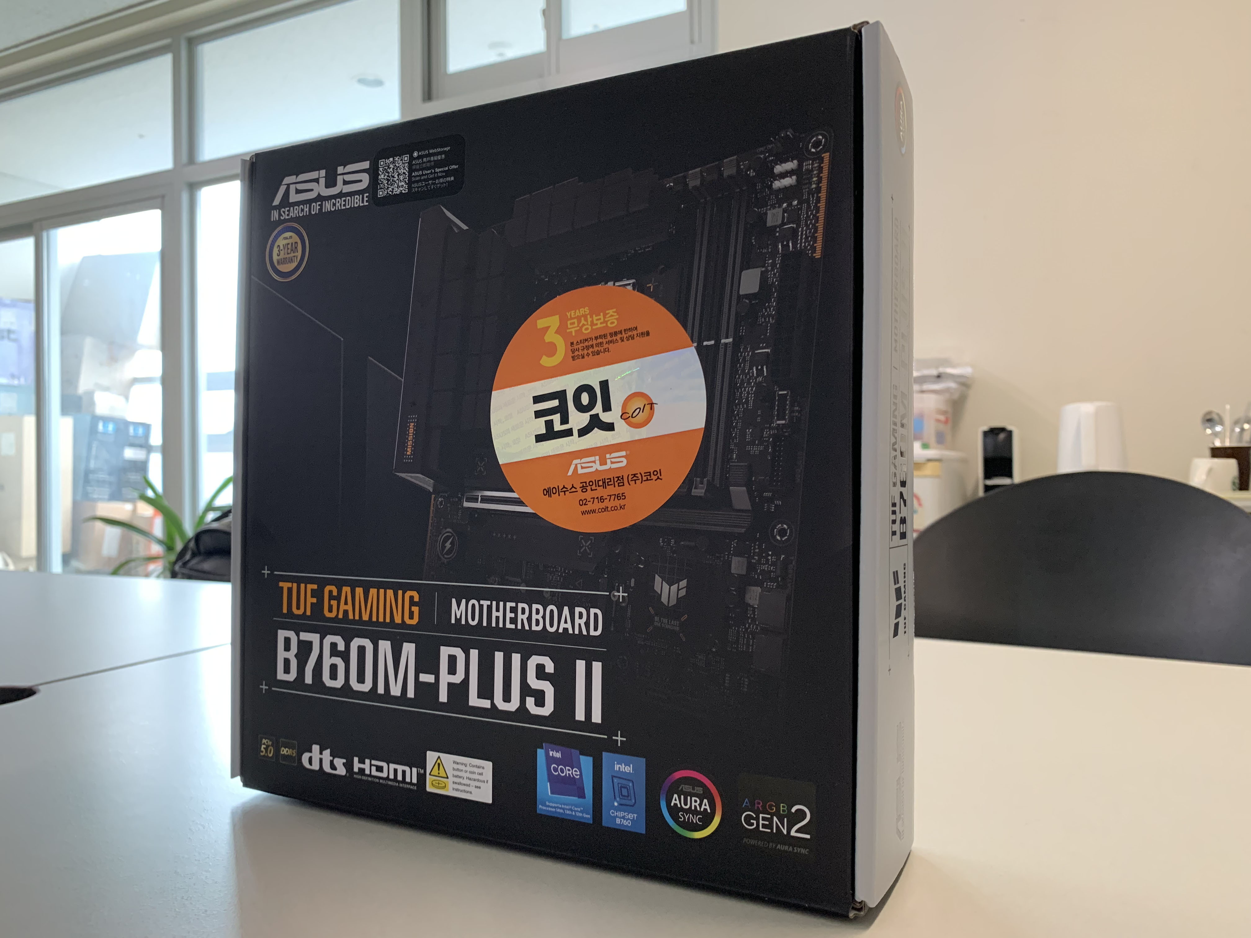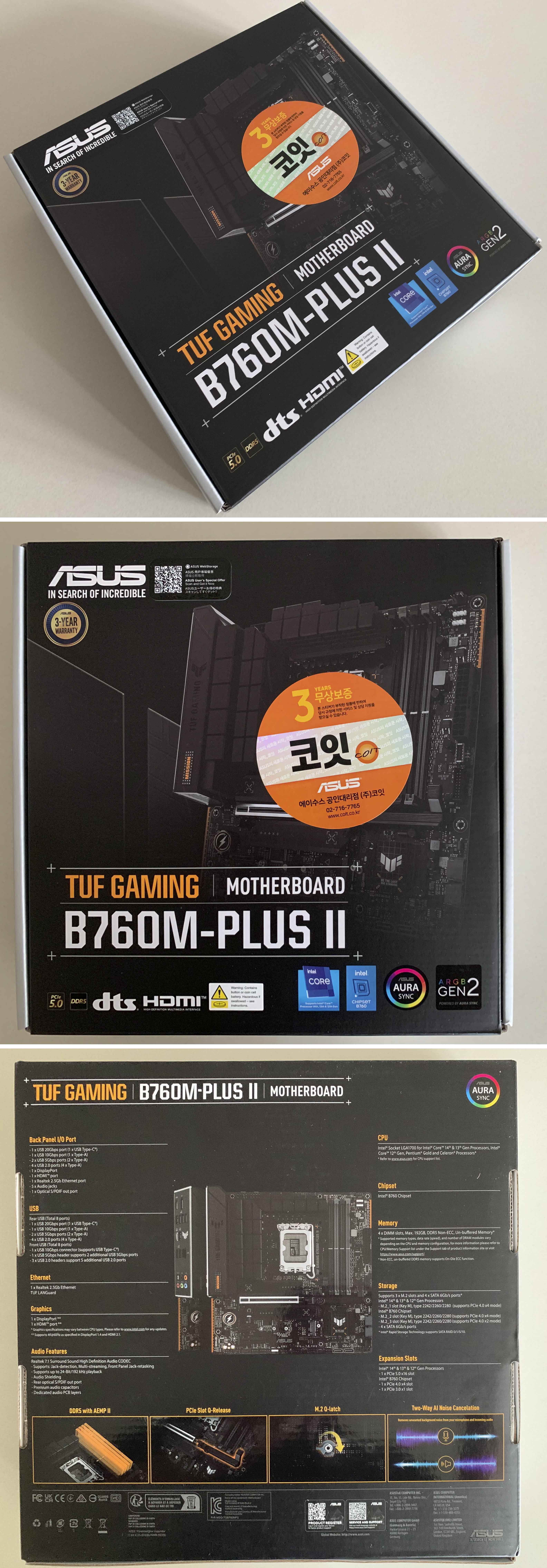 박스 앞면에는 ASUS 공인대리점 (주)코잇 3년 AS 무상보증 스티커가 붙어 있고, 뒷면에는 ASUS TUF Gaming B760M-PLUS II의 특징을 확인할 수 있습니다. TUF Gaming 제품답게 블랙을 베이스로 하고, 노란색으로 포인트를 준 디자인입니다.