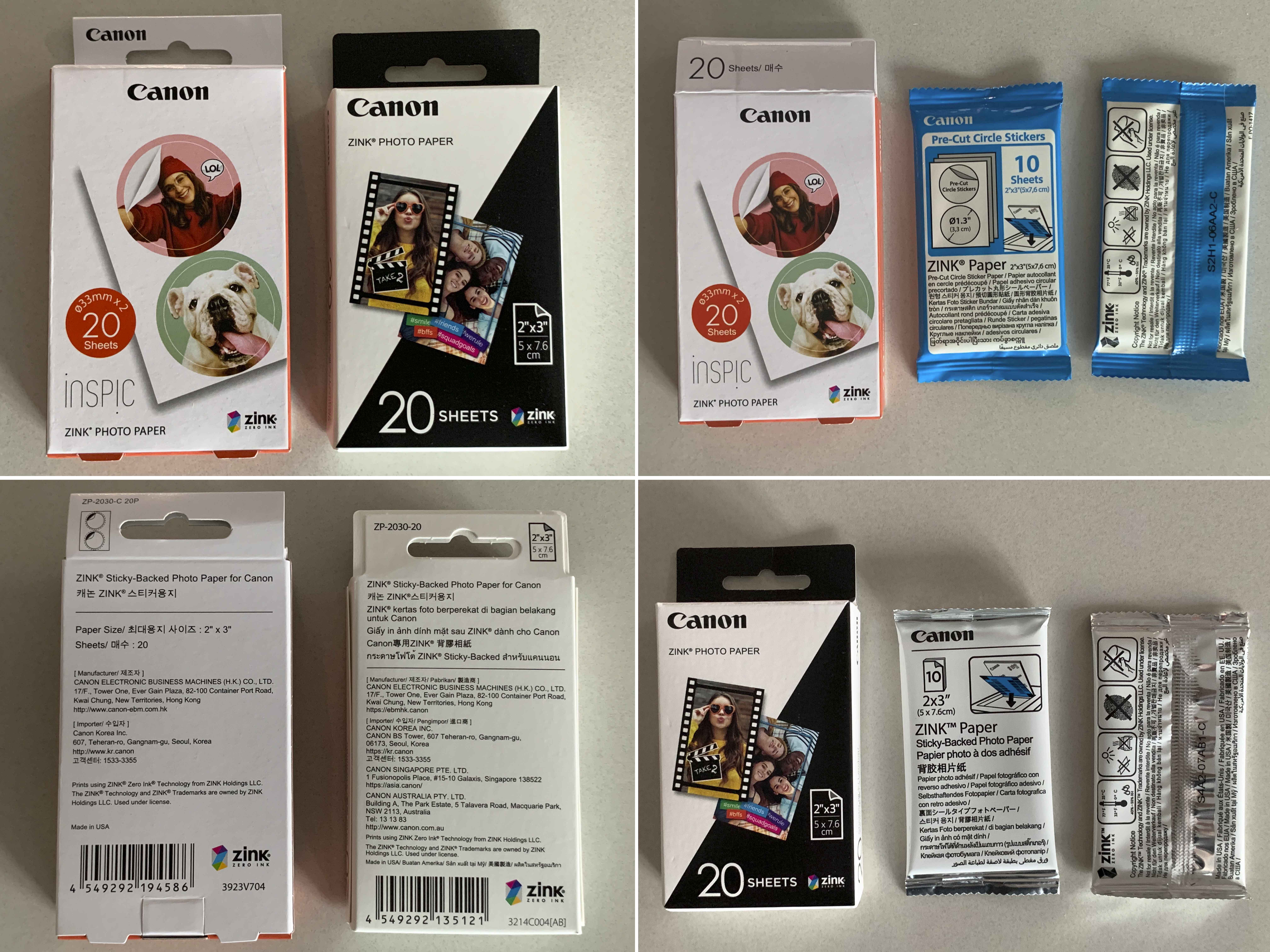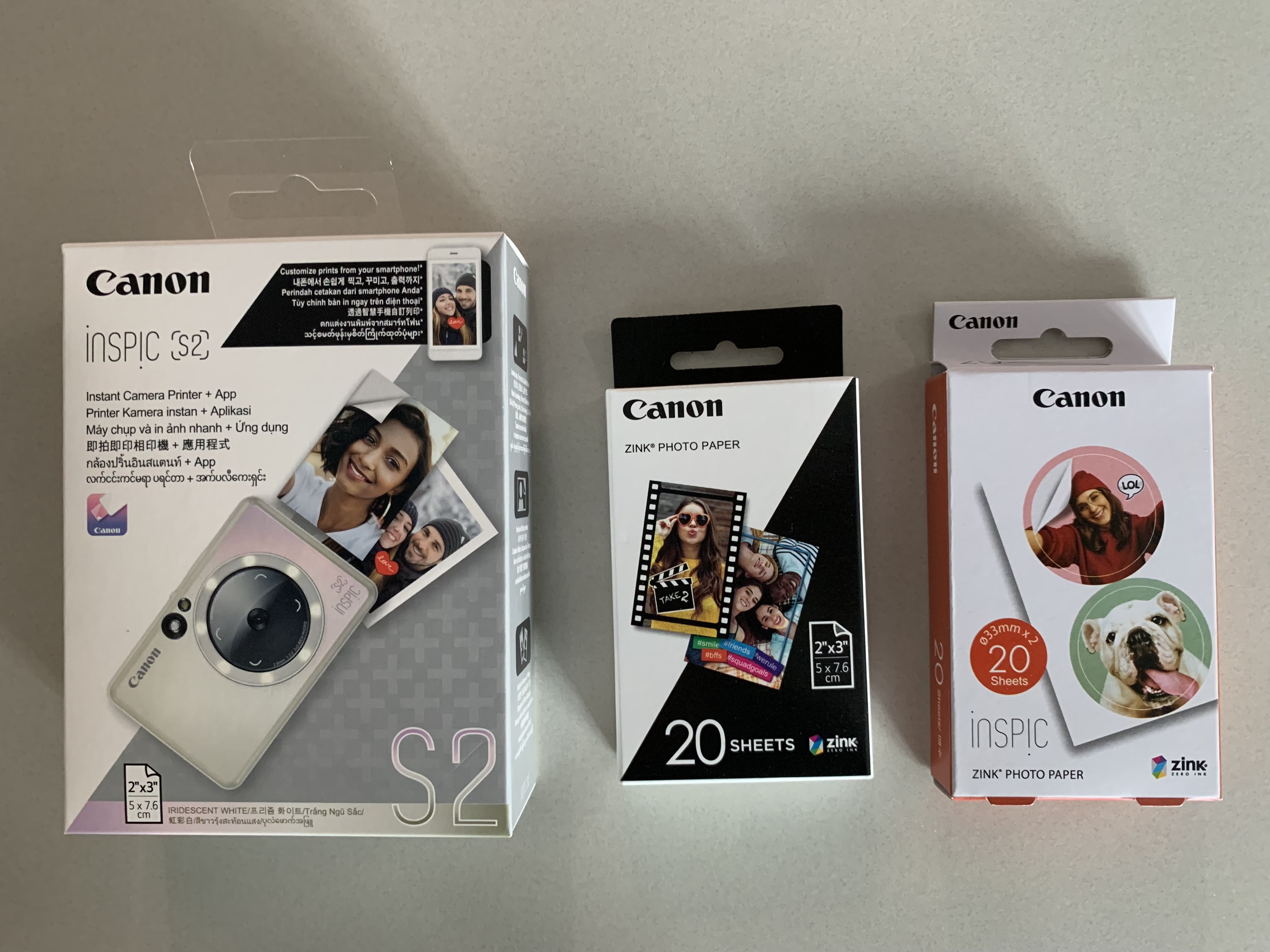 왼쪽에서 순서대로 캐논 인스픽S2, 인스픽 인화지 20, 인스픽 원형인화지 20매 입니다.
