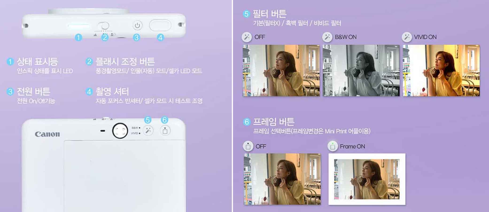사용법은 일반 카메라와 동작이 동일해서 간단합니다. 3번 전원을 누르고 켜면, 1번 상태 표시등에 불이 켜지는데, 4번 촬영 셔터를 눌러 작동합니다. 5번 필터 버튼으르 사진 분위기를 변경이 가능하며, 6번으로 인하된 사진을 멋지게 연출할 수 있습니다. 셀카 LED 모드로 화사한 조명을 지원하기 때문에 셀카 촬영이 낮은 분이라면 크게 만족하실겁니다.