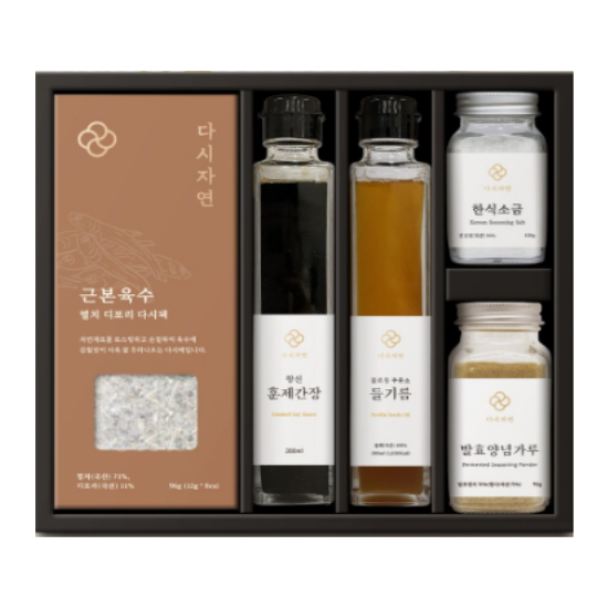 제조사 : 우리찬 브랜드 : 우리찬 등록일 : 2023.01 품목 : 조미료세트형태 : 선물세트,명절세트구성 : 발효양념가루 95g,볶은 참깨 소금 85g,고운 재래김가루 25g,한식소금 100g,멸치디포리 다시팩 96g(12gx8입),왕신 훈제간장 200ml,불로동주유소 들기름 200ml