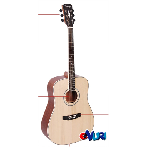 브랜드 : 스윙 등록일 : 2007.12 품목 : 어쿠스틱기타형태 : 드레드넛,미니프렛 : 20프렛바디(전판) : 솔리드스프루스바디(측판) : 마호가니바디(후판) : 마호가니넥 : 마호가니지판 : 로즈우드