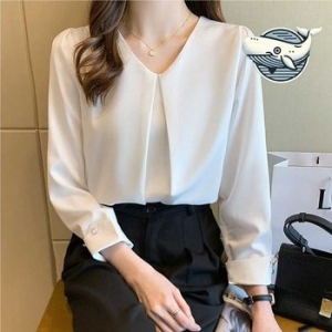 사틴 브이넥 긴팔 셔링 블라우스 우아한 여름 WFH6NZ9