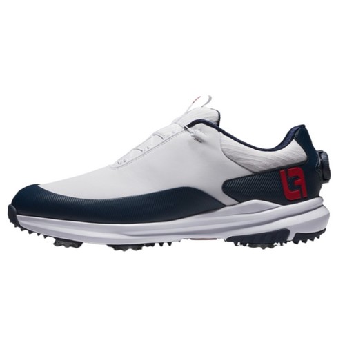 브랜드 : 풋조이 등록일 : 2025.03 품목 : 골프화형태 : 스파이크스파이크개수 : 6개사용대상 : 남성용특징 : 방수,보아시스템색상 : 네이비,화이트출시년도 : 2025년형