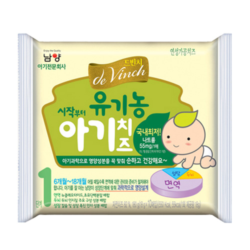 제조사 : 남양유업 브랜드 : 드빈치 등록일 : 2009.03 품목 : 치즈최소연령 : 6개월~인증정보 : HACCP인증,유기가공식품용량 : 1매당18g보관방식 : 냉장