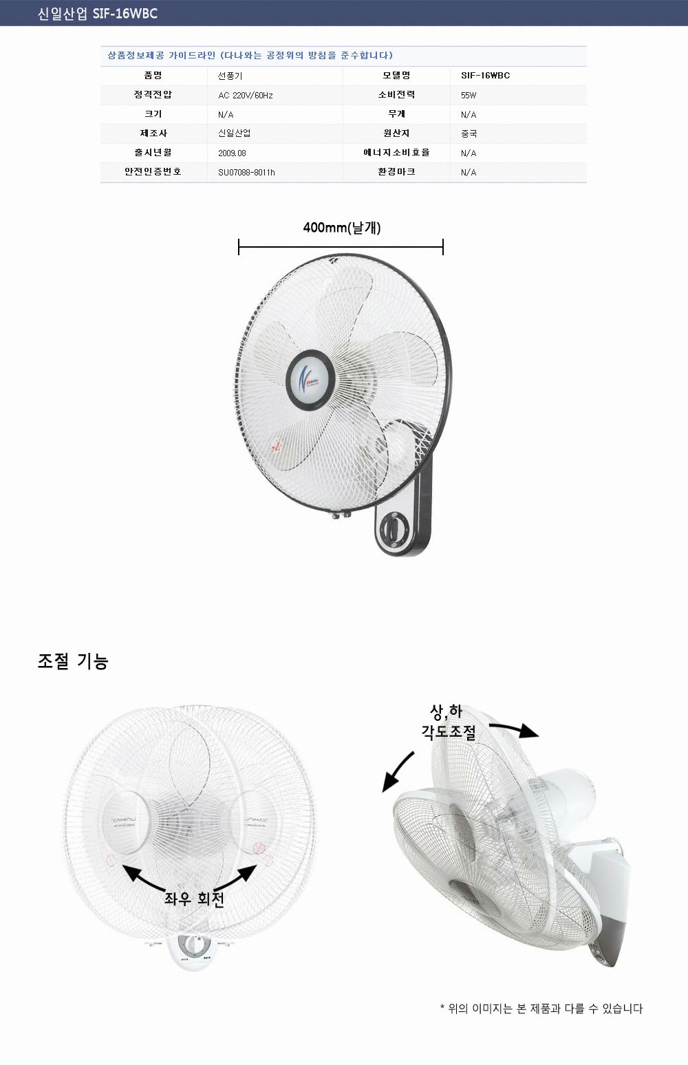 제조사 : 신일전자 등록일 : 2019.05 품목 : 선풍기형태 : 벽걸이형유/무선 : 유선바람 : 3단날개개수 : 5엽날개헤드조절 : 좌우회전,상하각도조절주요기능 : 리모컨날개 : 35cm(14인치)소비전력 : 50W