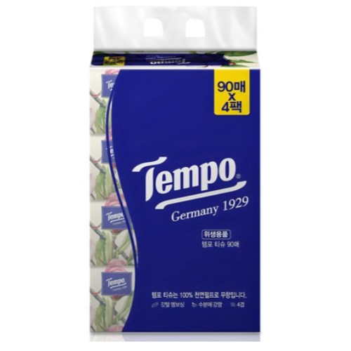 제조사 : 템포 브랜드 : 템포 등록일 : 2020.10 분류 : 미용티슈각 크기 : 직사각겹수 : 4겹펄프 : 천연펄프무형광 : O