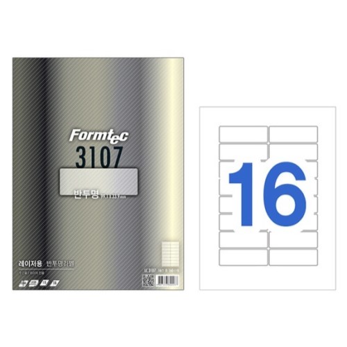 제조사 : 폼텍 등록일 : 2002.01 품목 : 라벨용지용도 : 주소용사용프린터 : 레이저전용규격 : A4색상구분 : 반투명칸수 : 16칸라벨형태 : 사각형칸크기 : 99.1x33.9mm