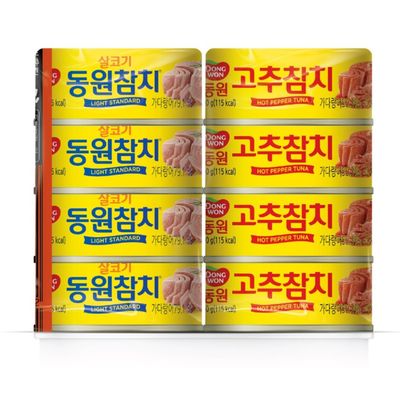 브랜드 : 동원F&B 등록일 : 2022.04 품목 : 참치캔세트총수량 : 총8개구성 : 라이트 스탠다드 참치 90g x 4개,고추 참치 90g x 4개