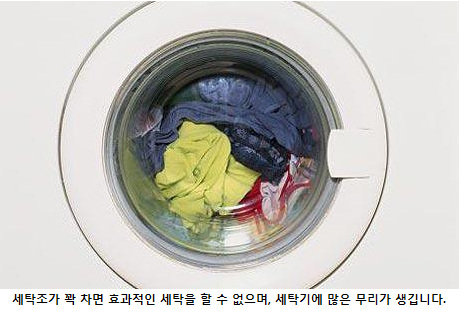 세탁이 됩니다. 그러므로 세탁조를 꽉꽉 채우면 깔끔한 세탁이 되지 않습니다.