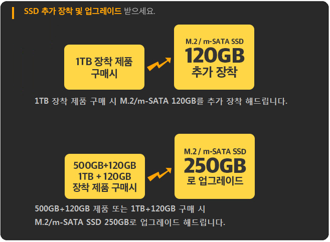 듀얼 스토리지 탑재 모델 구매 시 120GB SSD를 250GB로 무상 업그레이드 해드립니다.