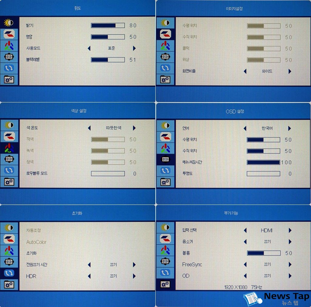 모니터 OSD는 아래 사진과 같다. 일반 모니터와 메뉴 구성은 크게 다르지 않다. 터치 기능은 PC와 USB로 연결시 알아서 설정되므로 OSD에서 만질 필요는 없다. 총 6개의 메인 메뉴로 구성되어 있으며, 세부 항목은 각각의 메뉴에서 제어할 수 있다.