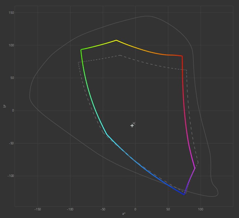 ▲ 점선으로 표시된 부분이 sRGB이며, 무지개 색으로 표시된 영역이 모니터가 지원하는 색 공간이다.