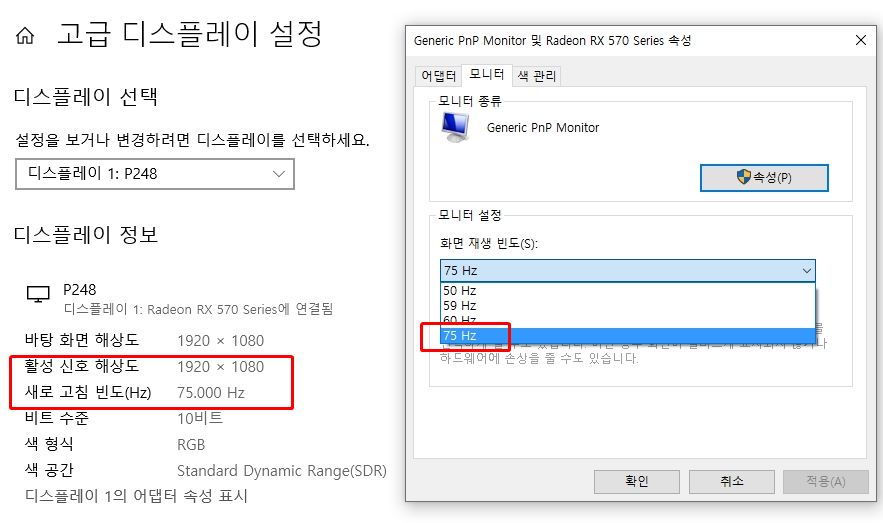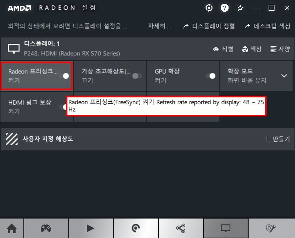 ▲ 48~75Hz 범위 내에서 주사율이 가변적으로 동기화하는 것을 알 수 있다.