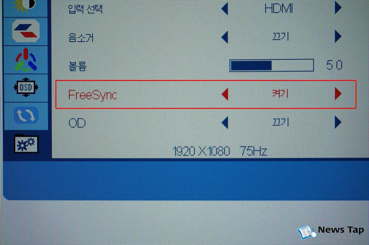 영상을 부드럽게 재생하기 위해 또 하나의 기술이 적용되었다. 바로 그래픽카드와 모니터 사이 영상 신호를 동기화함으로써 화면찢김(티어링) 문제를 해결하는 AMD 프리싱크(FreeSync) 기술이다. 모니터 OSD 메뉴에서 활성화 여부를 지정할 수 있다. 프리싱크 기능을 켜면 그래픽카드에서 출력되는 영상 신호와 모니터 화면 주사율이 동기화되어 화면찢김이나 끊김 등의 부자연스러운 출력 문제를 해결한다. 그만큼 화면에 더욱 집중할 수 있다. 프리싱크 기능을 켜면 아래 그림처럼 48~75Hz 범위 내에서 주사율이 가변적으로 변하는 것을 알 수 있다.