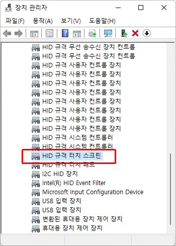 터치스크린 기능을 이용하기 위해서는 모니터와 PC 사이에 USB만 연결하면 된다. 윈도우10/11의 경우 별도의 드라이버도 필요 없다. 케이블을 연결하는 순간 아래와 같이 ‘HID 규격 터치 스크린’으로 인식한다. 화면에 터치하는 것만으로 마우스를 대신해 원하는 앱을 실행하고 제어할 수 있다.