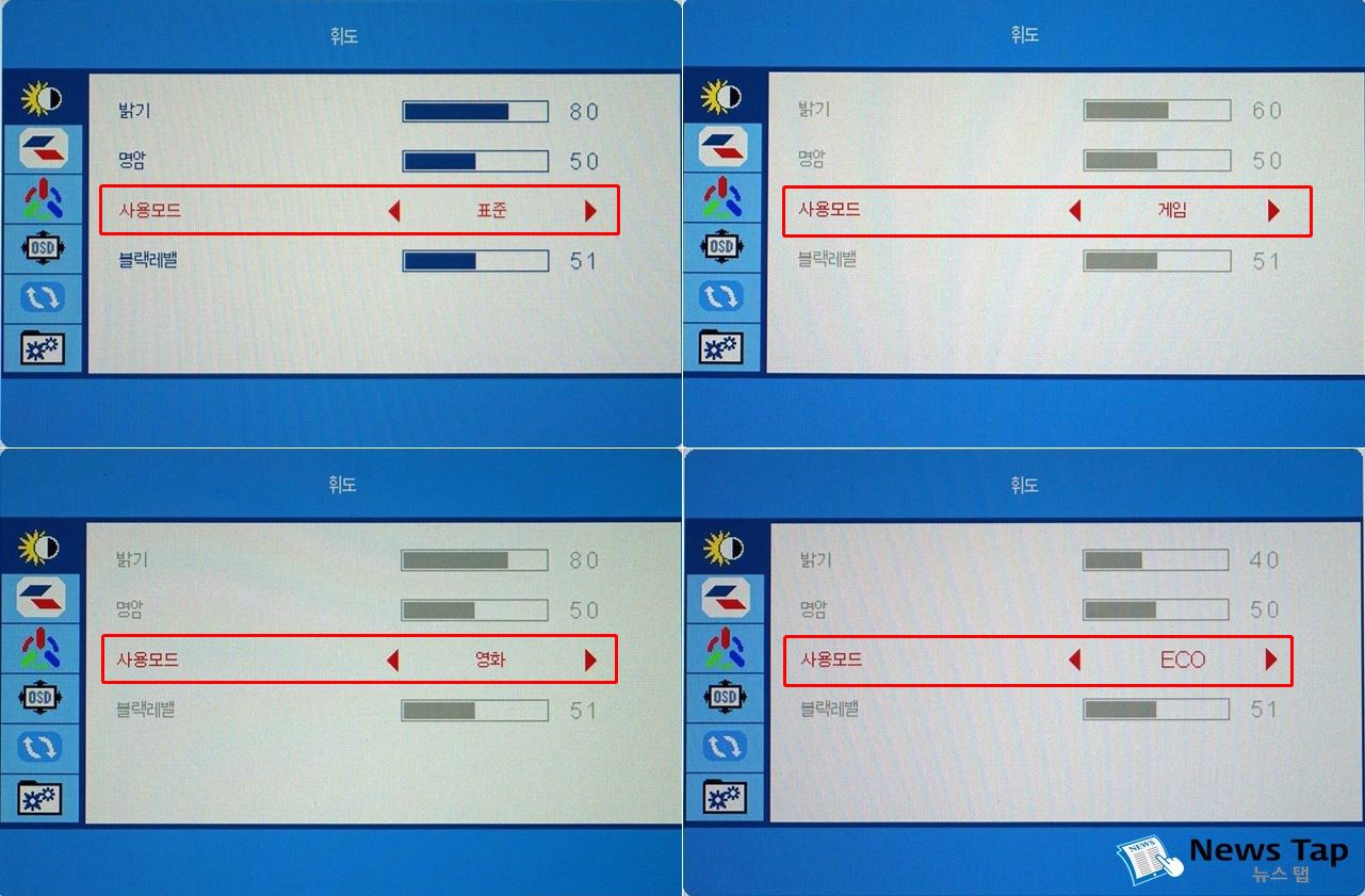 콘텐츠에 따라 최적의 화질로 쓸 수 있도록 몇 가지 화면모드도 담았다. 표준모드 외에 게임, 영화 모드가 있으며 소비전력을 절감할 수 있는 ECO 모드도 선택할 수 있다.