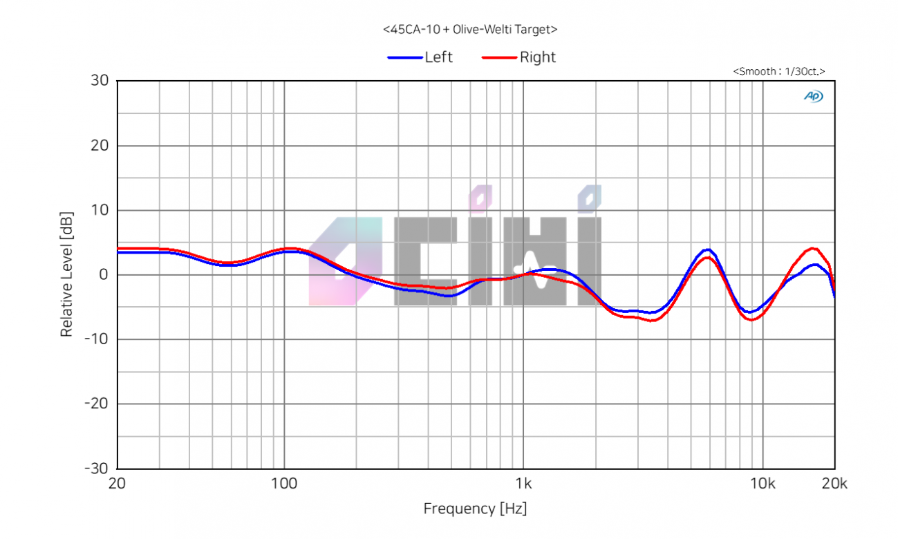가장 먼저 보는 그래프는 올리브-웰티 타겟을 적용한 주파수 특성 그래프입니다. 1/3옥타브 스무딩을 적용하여 실제 청음과 비슷하고 보기에도 편한 그래프입니다.