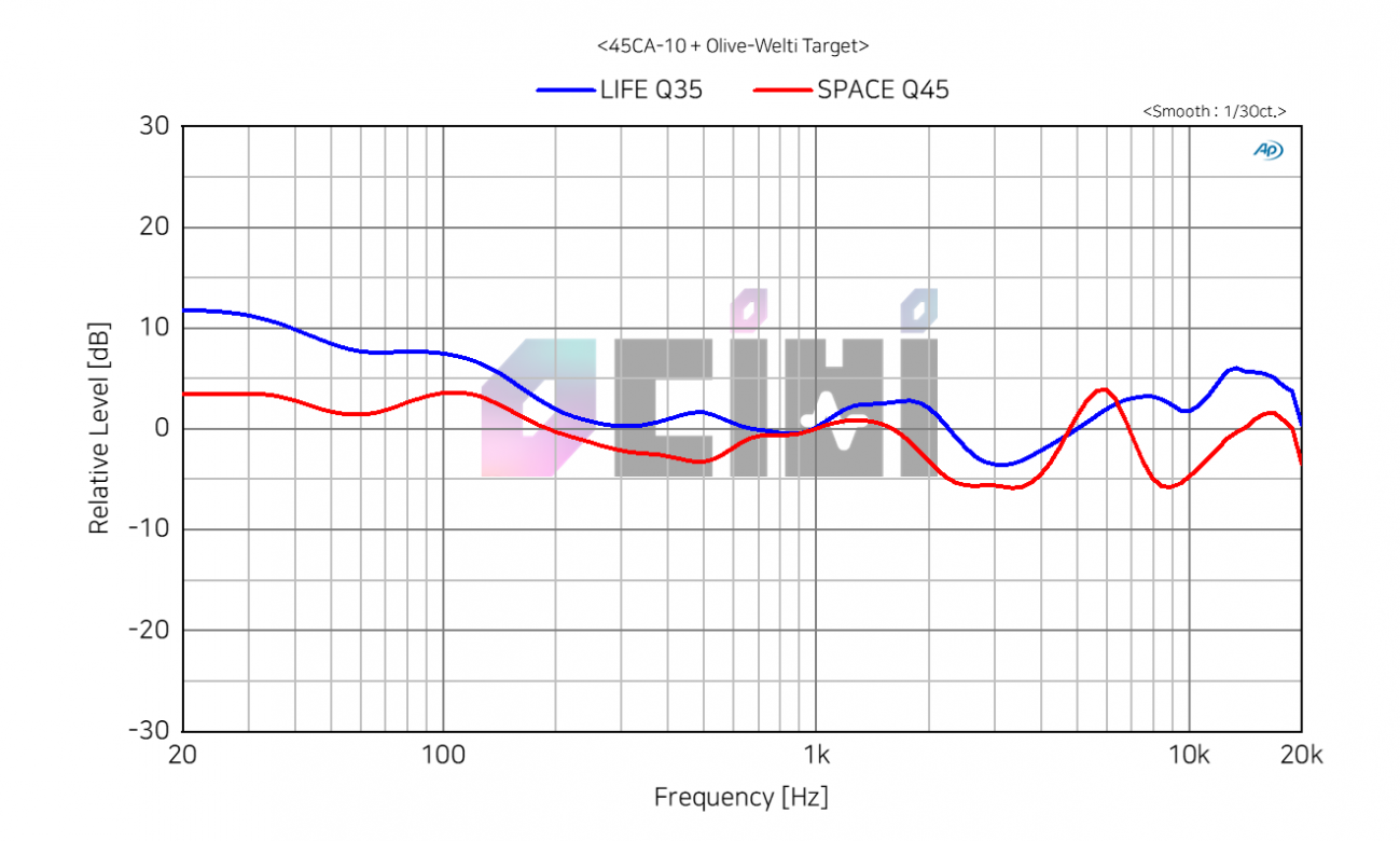 전작인 LIFE Q35와 비교한 그래프입니다. 전작에서 부하게 느껴지던 저음이 적당한 수준으로 내려오고 고음도 더 차분해지는 등 음색 밸런스가 좋아졌습니다.