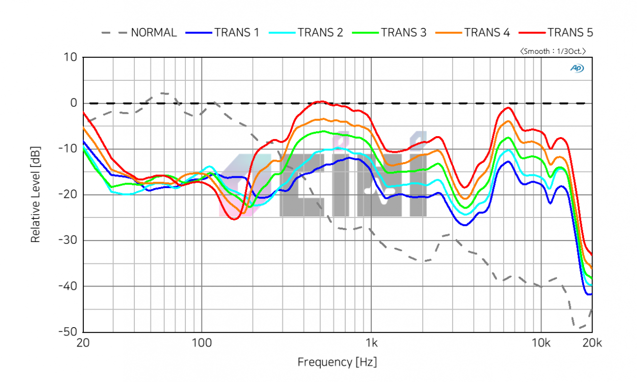 외부 소음 모드의 단계별 측정 데이터입니다. 1-5단계 모두 ANC가 작동해 저음은 어느정도 차단하고 있습니다. 초고음을 보면 마이크 성능이 좋은 것을 확인 가능합니다. 1~2 단계가 가장 자연스럽게 들렸습니다.