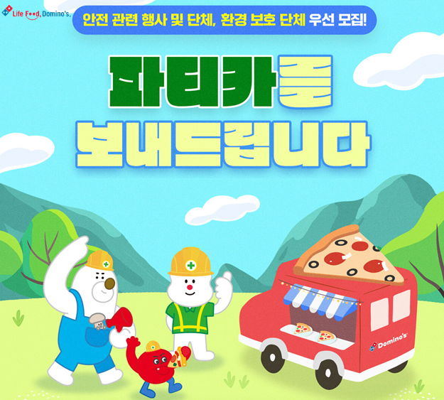 도미노피자는 오는 27일(월)까지 한국도미노피자 홈페이지를 통해 파티카 사연을 모집한다. 환경 보호 단체와 안전 관련 단체 및 행사를 우선 모집하며, 출동 날짜는 협의 후 진행된다. 이 외에도 초·중·고·대학교는 물론 소방관, 경찰관 등 모든 고객은 소중한 지인들에게 파티카를 선물할 수 있다.