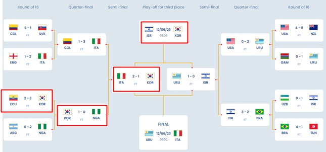 '어게인 2019'를 노린 한국의 김은중호는 9일 오전 6시(한국시간) 아르헨티나 라플라타 스타디움에서 열린 2023 아르헨티나 국제축구연맹(FIFA) 20세 이하(U-20) 월드컵 4강 이탈리아전에서 0-1로 뒤진 전반 23분 이승원의 페널티킥 1-1 동점골을 터뜨리며 역전의 발판을 마련했으나 후반 41분 시모네 파푼디에게 프리킥 결승골을 내줘 1-2로 패배, 2회 연속 결승 진출에는 실패했다.