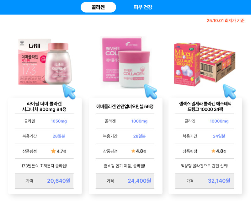 "A. 콜라겐은 분자 크기가 작을수록 체내 흡수율이 높아집니다. 따라서 '저분자 콜라겐 펩타이드' 형태의 제품을 선택하는 것이 좋습니다. 또한, 콜라겐 합성을 돕는 비타민C 함유 여부도 확인하시면 좋습니다.
