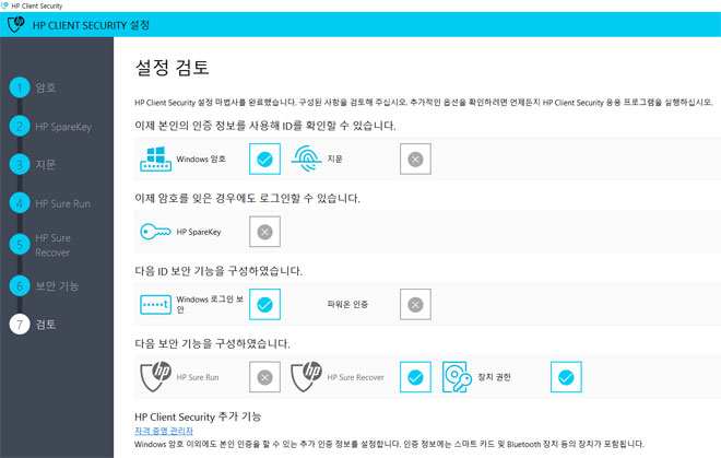 또한, HP 클라이언트 시큐리티를 통해 앞서 말한 얼굴인식, 지문인식, 백업, 보안소프트웨어 등을 총괄 관리하는 기능을 제공해, 복잡한 보안 서비스를 별도로 따로따로 세팅할 필요 없이 간단하게 HP 클라이언트 시큐리티로 총괄 정리가 가능하다.