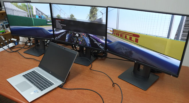 HP EliteBook 1050 G1과 함께 트리플 모니터 구성은 데이지체인 형식을 이용해 하나의 썬더볼트 포트를 이용하는 방식이다.