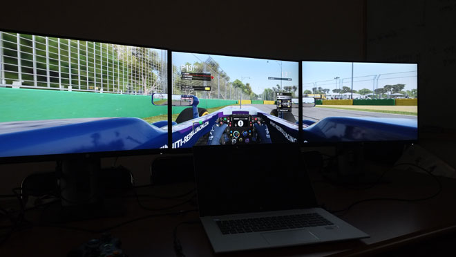 탁트인 시야로 인해 더욱 시원시원하고 몰입감 있는 레이싱을 할 수 있었고, 사실상 5K 해상도로 연결된 3대의 모니터를 구동함에도 게임을 원활하게 구동시키는 HP EliteBook 1050 G1 노트북의 성능도 놀라웠다.