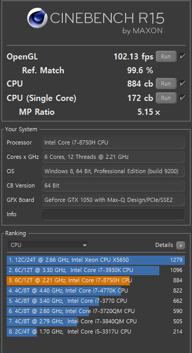 먼저 CPU의 시네벤치 R15를 통해 테스트를 진행 해본 결과 멀티코어점수는 약 884점정도로 헥사코어의 힘과 H프로세서의 성능이 준수한 결과를 보여주었다.