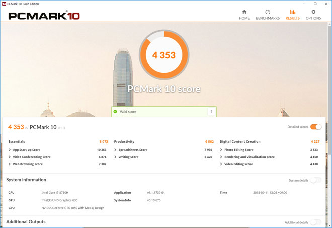 PCMark를 통해 오피스환경, 업무적인 환경에서 활용했을 때의 스코어를 체크 해보면, Essentials 혹은 Productivity 쪽은 여타 노트북들과 큰 차이를 보이지 않았지만, 디지털 컨텐츠 제작 부분에 있어서는 다소 점수가 향상된 모습이다.
