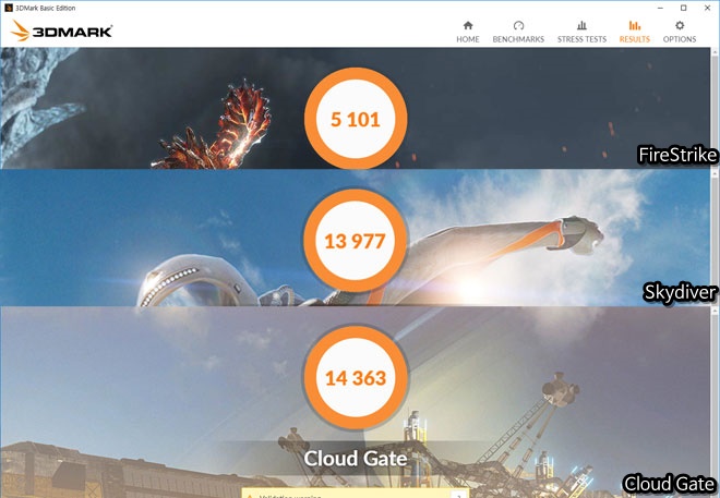확실히 데스크탑에서 테스트하던 파이어 스트라이크 점수는 일반적인 게이밍 데스크탑들보다 낮은 점수를 기록한 모습이지만, 스카이다이버나 클라우드 게이트의 경우에는 1만 점이 넘는 고점을 기록하며 울트라북 급의 노트북에 있어서는 3D 성능은 거의 최상급에 해당하는 모습을 볼 수 있었다.