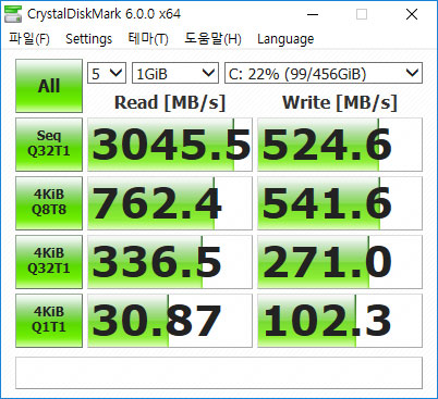 기본적인 읽기 속도는 NVMe에 해당하는 읽기 속도가 측정되었지만, 쓰기 속도가 NVMe라고 하기에는 다소 아쉬운 속도로 체크되는 모습이였다.