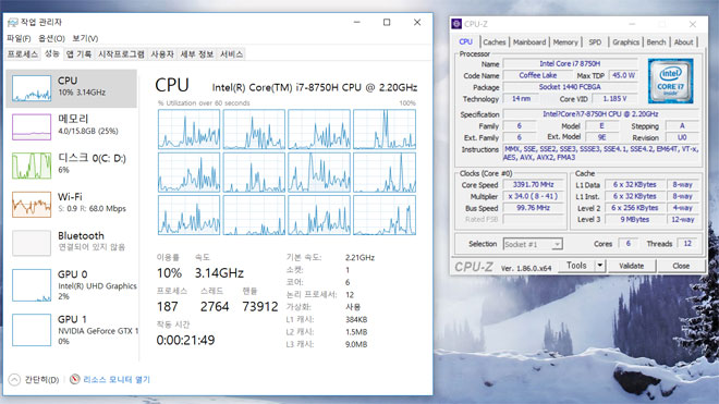 특히, 이번 HP EliteBook 1050 G1에 장착된 모델은 8세대 헥사 코어인 6코어 12스레드를 지원하고, 2.2GHz 기본클럭에서 최대 4.1GHz까지 부스트 되는 매우 고사양 CPU가 장착되어 있다.