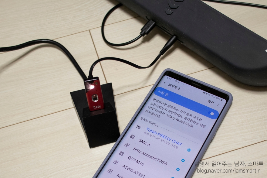 차량에 있는 AUX 포트에 TUNAI 차량용 블루투스 리시버 Firefly chat의 오디오 케이블을 연결하고, USB 포트에 전원을 연결하였습니다. 역시, 스마트폰에 Firefly Chat을 등록해 두었기 때문에, 특별한 절차 없이 바로 사용이 가능했습니다. 스마트폰을 2개 들고 다니는데, 이 제품은 최대 2개의 장치와 연결이 가능합니다.