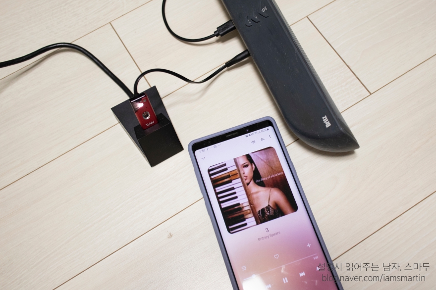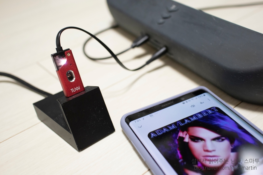 TUNAI 차량용 블루투스 리시버 Firefly chat의 LED가 밝게 빛을 내면서 음악을 재생해 줍니다. 차량용 블루투스 리시버라고 하지만, 실제로는 차량이 아닌 AUX 포트가 있는 제품이면 모두 사용이 가능합니다.