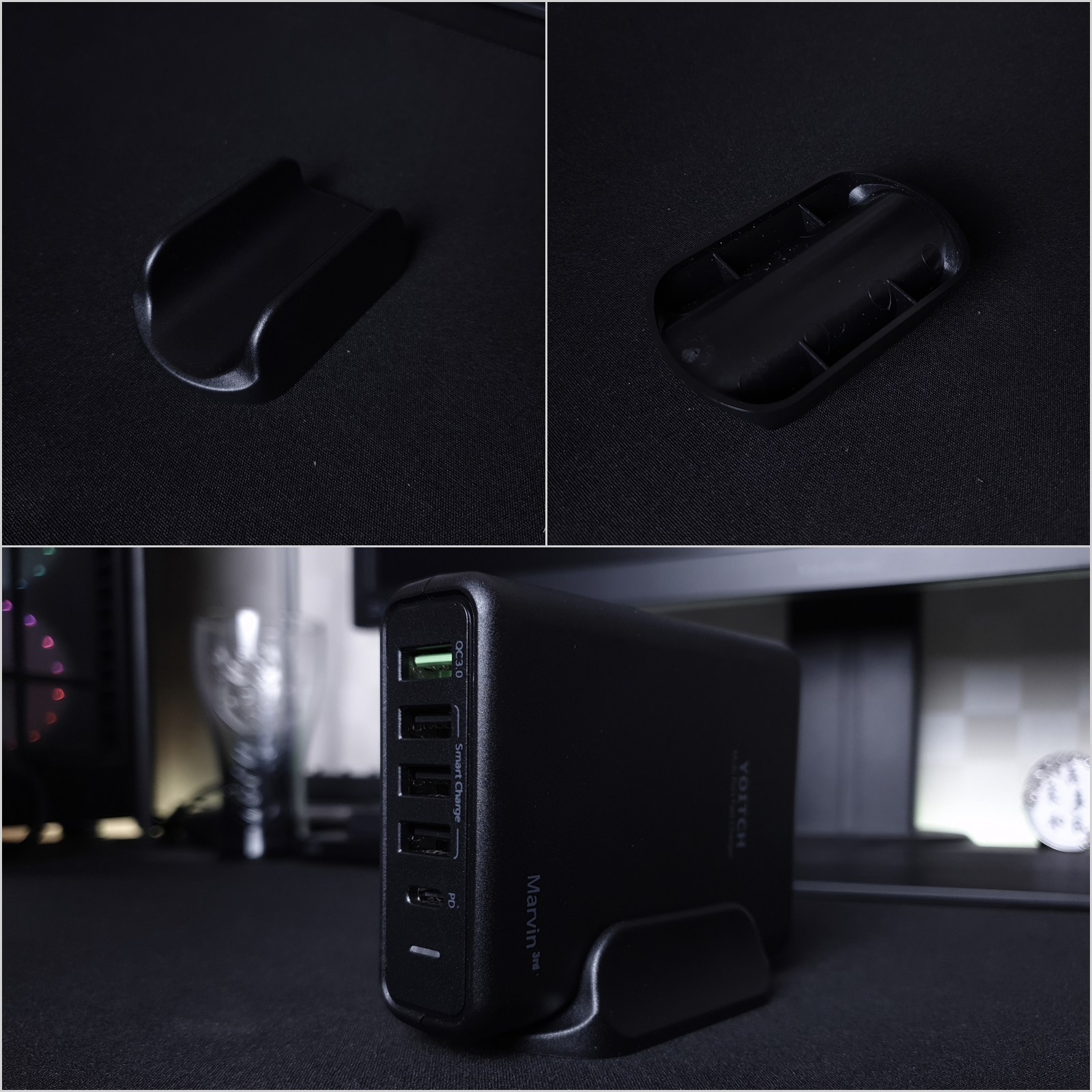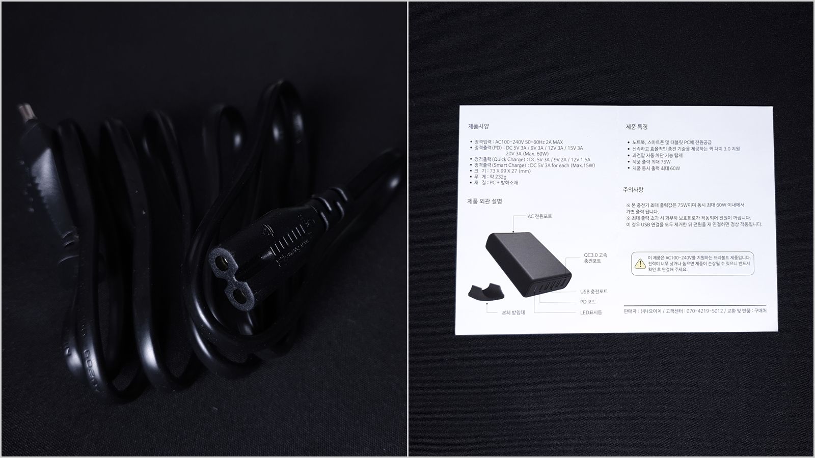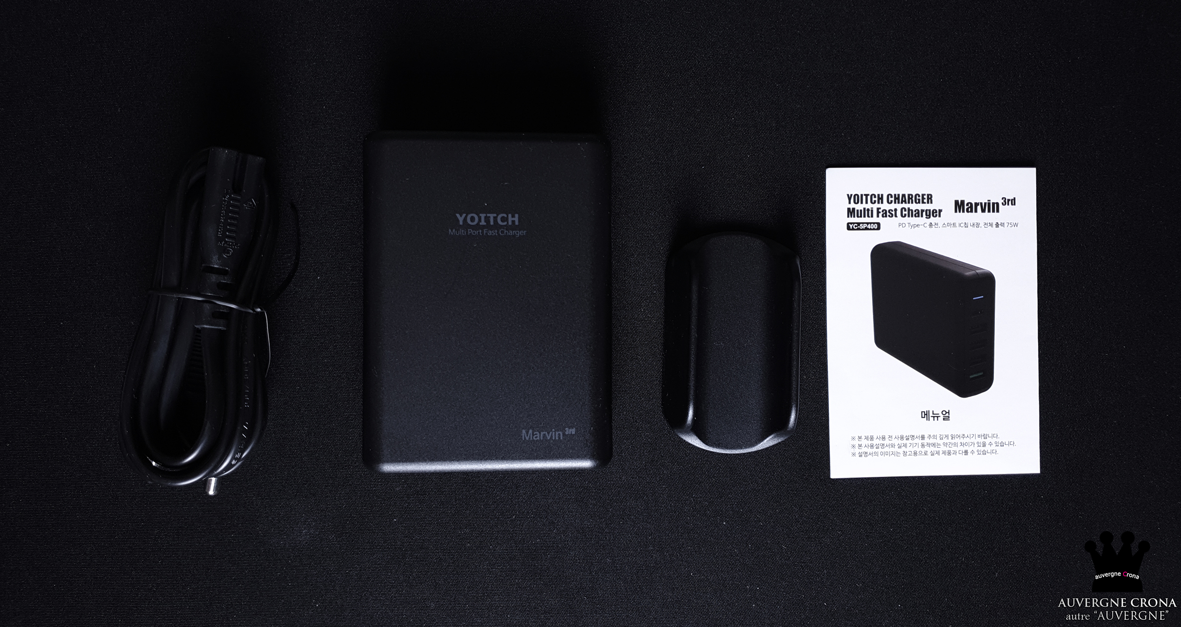 ▲ 구성품은, 요이치 마빈 3세대 멀티 고속 충전기 본체와 전원 케이블, 거치대, 사용 설명서로 구성되어 있습니다.