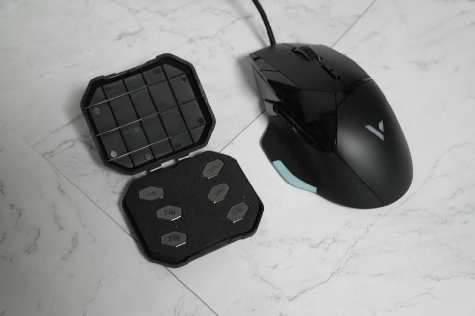 그리고 특이한 게 이 제품은 무게 추를 제공해 줍니다. 3g 짜리 추를 6개 제공해 줍니다. 마우스 왼쪽에 있는 민트색 손잡이를 아래로 내리면 뒤편이 열립니다. 여기에 자신의 기호에 맞게 추를 넣으면 됩니다. 이 마우스가 120g이지만 선을 제외하면 110g 정도 됩니다. 무게가 가볍지는 않습니다. 아쉬운 점은 마우스 무게를 좀 더 줄였으면 무게 추로 기호에 맞게 폭넓게 사용할 수 있었을 텐데.