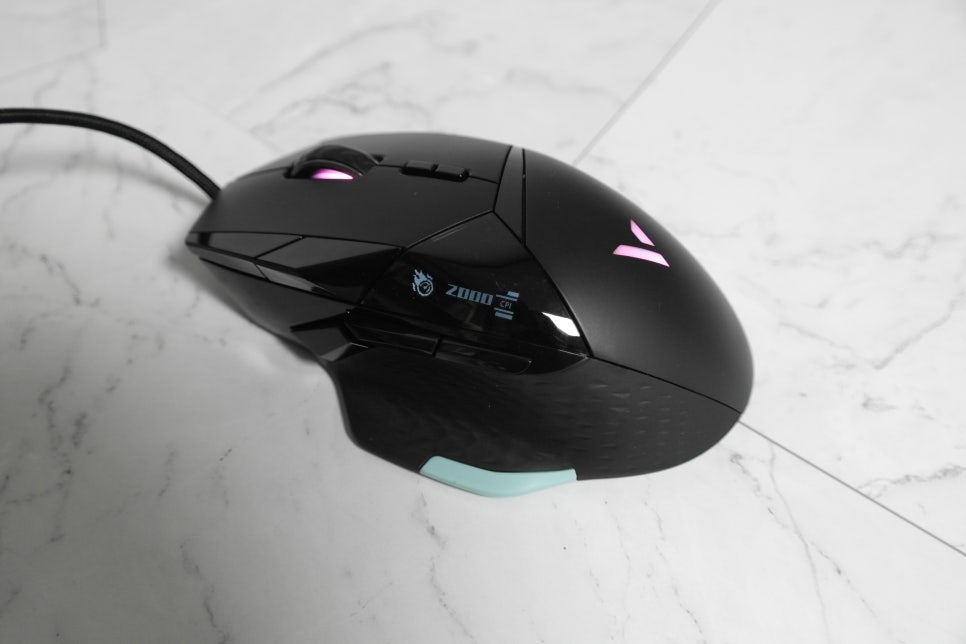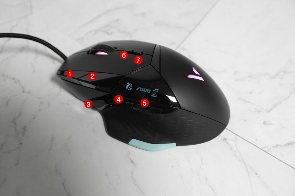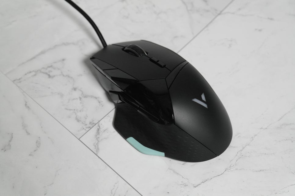 마우스 디자인을 보면 상당히 세련된 디자인에 인체공학적으로 설계가 되었습니다. 왼쪽에 7개의 커스터마이징이 가능한 버튼이 있고 RGB LED로 디자인된 로고와 휠이 보입니다. 여기에 전체적으로 러버코팅으로 마감을 했습니다.