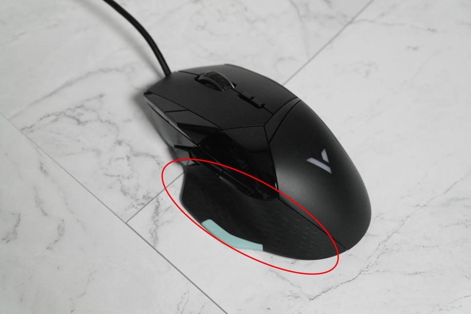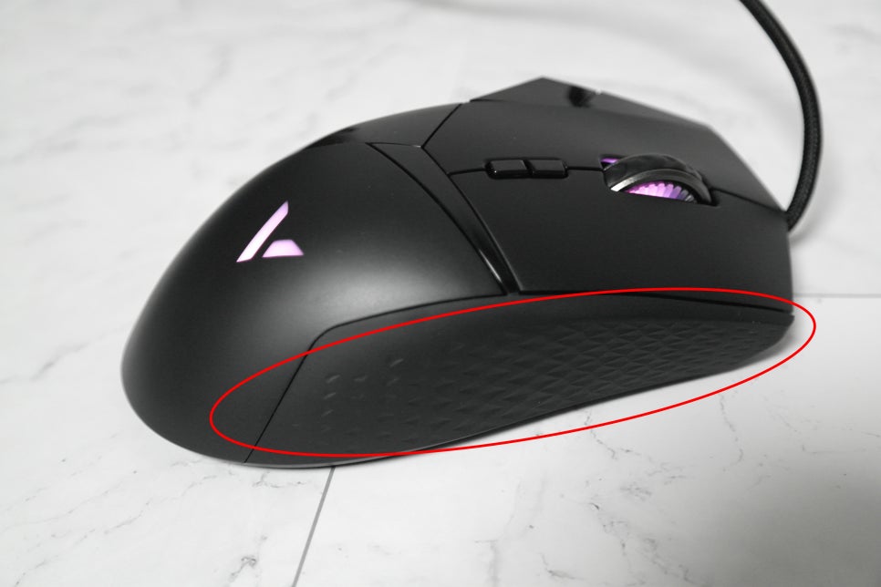 그리고 양 마우스 사이드에는 느낌이 좋은 실리콘 재질로 되어있습니다. 사진처럼 손으로 잡히는 부분 전체에 들어가 있습니다. 다른 마우스의 경우 원가절감을 위해 부분적 사용하거나 넣지 않는데 굉장히 널찍하게 있는 걸 볼 수 있습니다.