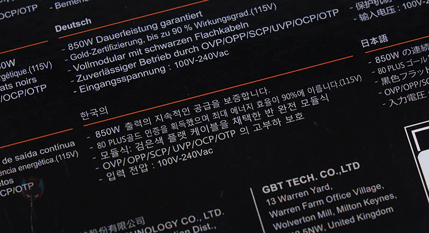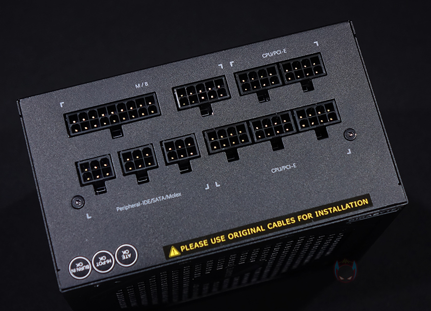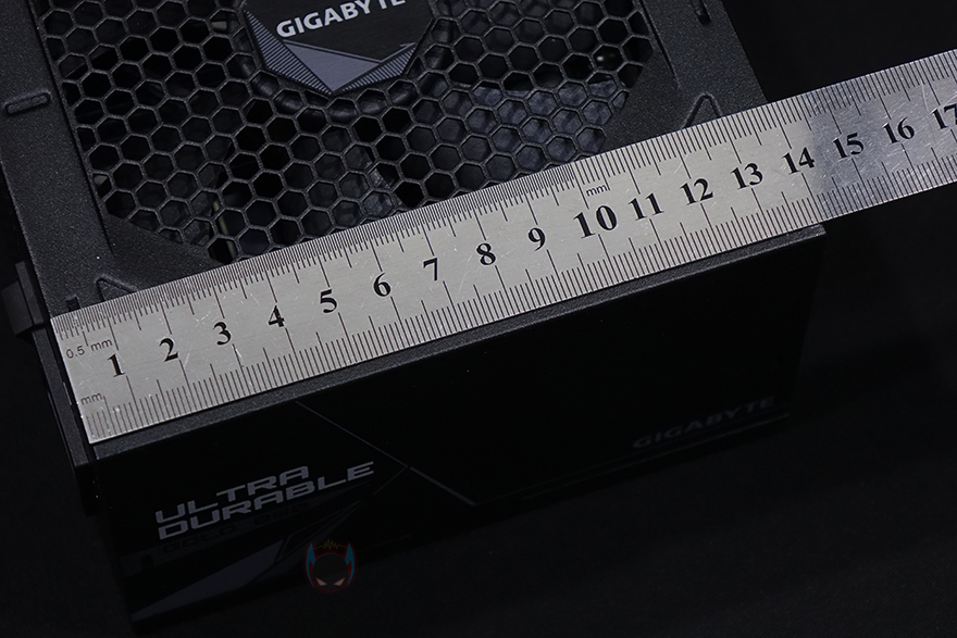 기가바이트 UD850GM 80PLUS GOLD 풀모듈러 파워서플라이 본체부터 살펴보면, 본체 깊이 길이가 140mm로 최근 파워서플라이 시장의 트랜드인 용량은 크면서 길이는 짧은 특징을 적용하고 있습니다. 여기에 전반적인 디자인은 먼저 나왔던 자사의 P시리즈 풀-모듈러 제품과 비슷하며, 본체 샤시 자체에 벌집모양 에어홀 디자인을 처리하면서 내부에 120mm 팬을 장착하고 있습니다. 물론, 후면도 배기효과를 위해서 벌집모양 에어홀 처리를 해놨죠. 전면에는 모듈러 케이블과 연결되는 커넥터들이 배치되어 있는데, 쉽게 구분할 수 있게 케이블별로 표기를 해놨습니다. 그리고, 측면에는 모델명, 바닥부분에는 해당 제품의 기본 사양표기를 다시 확인할 수 있습니다.