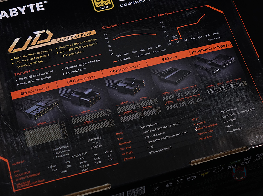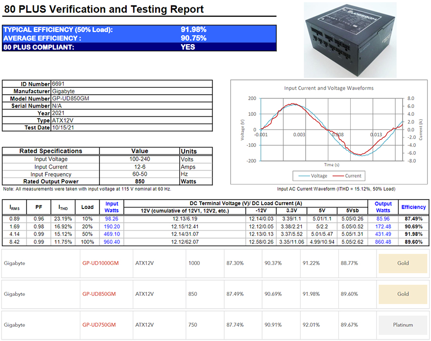 끝으로, 기가바이트 UD850GM 80PLUS GOLD 풀모듈러 파워서플라이는 80Plus 골드 등급 인증을 받았습니다. 실제, 80Plus 홈페이지를 통해 해당 모델의 전력효율을 확인해보면, 일반적인 50% Load 상황에서 약 91%의 효율을, 평균적으로도 약 90%의 전력효율을 가졌다라는 것을 확인할 수 있습니다. 또한, 1000W 용량의 UD1000GM 모델도 골드등급을 받은 것을 확인할 수 있고, 특히 750W의 UD750GM 모델은 같은 UD 라인업에 있기때문에 제품박스에는 80Plus 골드로 동일하게 표시되어있지만, 실제 등급은 한단계 높은 플래티넘 등급을 받았다라는 점에서 3개 모델 중 가장 효율성이 좋다 할 수 있겠습니다.