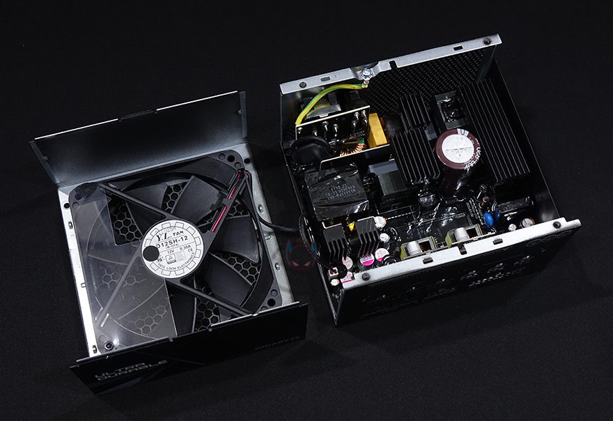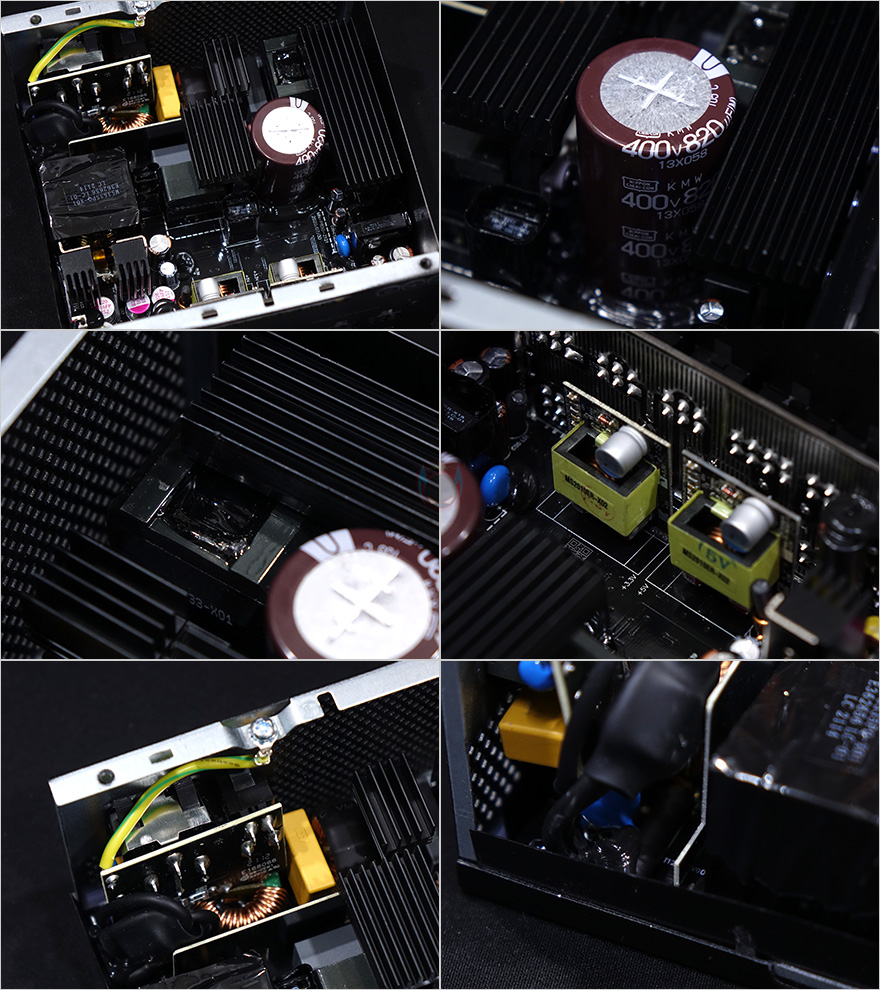 기가바이트 UD850GM 80PLUS GOLD 풀모듈러 파워서플라이 본체 내부를 잠깐 살펴보면, 내부에 장착된 120mm 팬은 파워서플라이 제품에 많이 사용되는 YATE LOON사 제품을 사용하고 있으며, 공기흐름을 위해 에어가드도 장착되어 있습니다. 또한, 장착된 120mm 팬은 스마트-팬으로 소비전력이 170W이하일경우에는 팬이 작동하지 않습니다. 쉽게 말해, 170W이하에선 팬이 작동하지 않아도 충분히 내부 발열을 해결할 수 있다라는거죠. 그래서, 내부에는 곳곳에 알루미늄 방열판을 적용하고 있으며, 400V/850㎌ 용량의 메인캐패시터는 일본산 제품을 사용했고, 전력효율을 위한 Active PFC, DC-to-DC 컨버터, 고주파음 최소화를 위한 EMI 필터, 내부전류흐름방지의 접지, 안전퓨즈 등을 눈으로 확인할 수 있습니다. 이외에도 앞서 제품박스에서 확인했듯이 총 6가지(OCP/OTP/OVP/OPP/UVP/SCP) 보호회로도 적용되어 있죠.