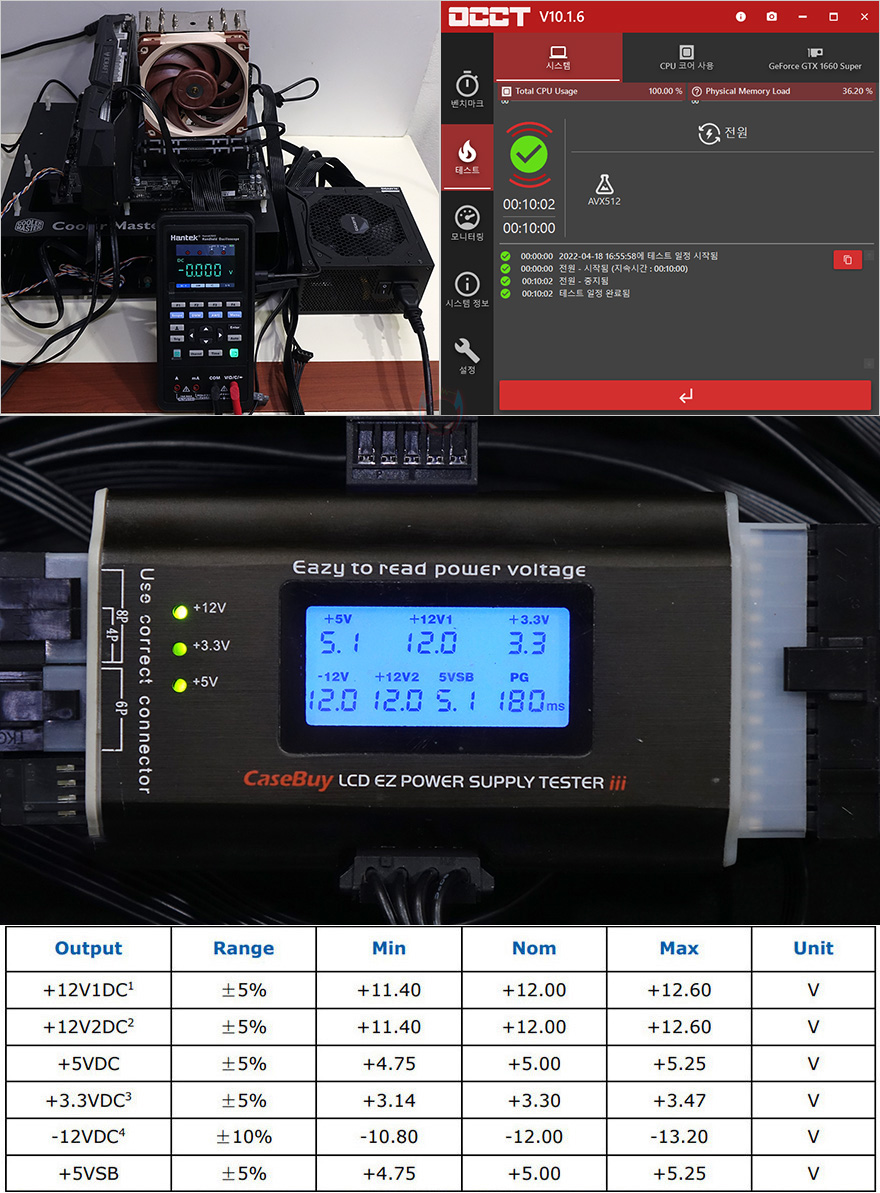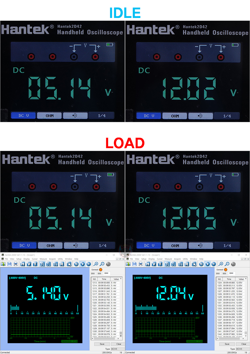 OCCT 프로그램을 통해 Load와 Idle 상황에서 각각 5V와 12V 전압 움직임을 측정해보면, 5V는 Idle과 Load 모두 동일한 상태로 일명 칼전압 상태로 매우 안정적인 출력을 보여주고, 12V 역시 Idle과 Load에서 각각 0.01V, 전체 변동폭도 0.02V 수준으로 매우 낮은 변동폭으로 안정적으로 출력되는 것을 확인할 수 있습니다. 그래픽카드와 메인보드에 공급되는 주요 12V 전압을 생각하면 품질은 충분히 만족스럽다 할 수 있죠.