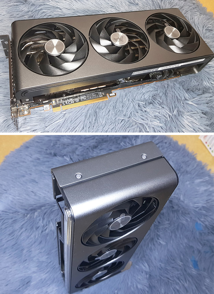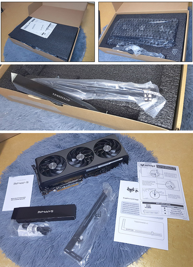박스 속 내용물은 RX 7800 XT 본체, 퀵 설치 가이드, 5V 3핀 ARGB 케이블, 그래픽 카드 서포트 브라켓 (지지대) 등으로 이루어져 있다.  그래픽 카드 지지대는 PCIe 슬롯 나사에 의해 고정되는 방식인데,  필자의 PC케이스와는 잘 맞지 않아서 여기서는 사용하지 않았다.