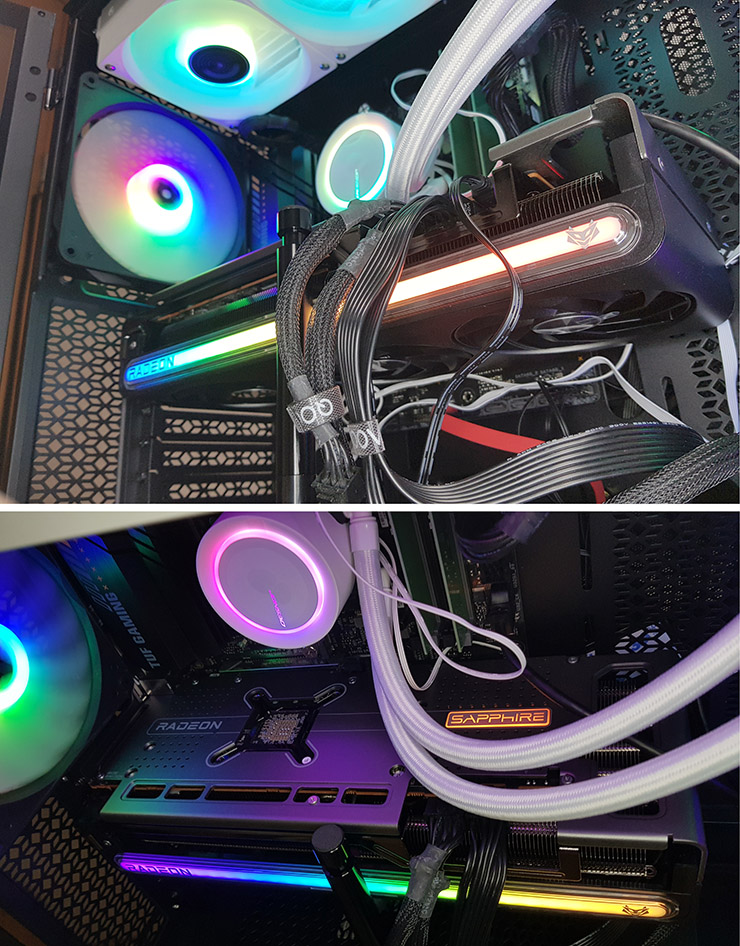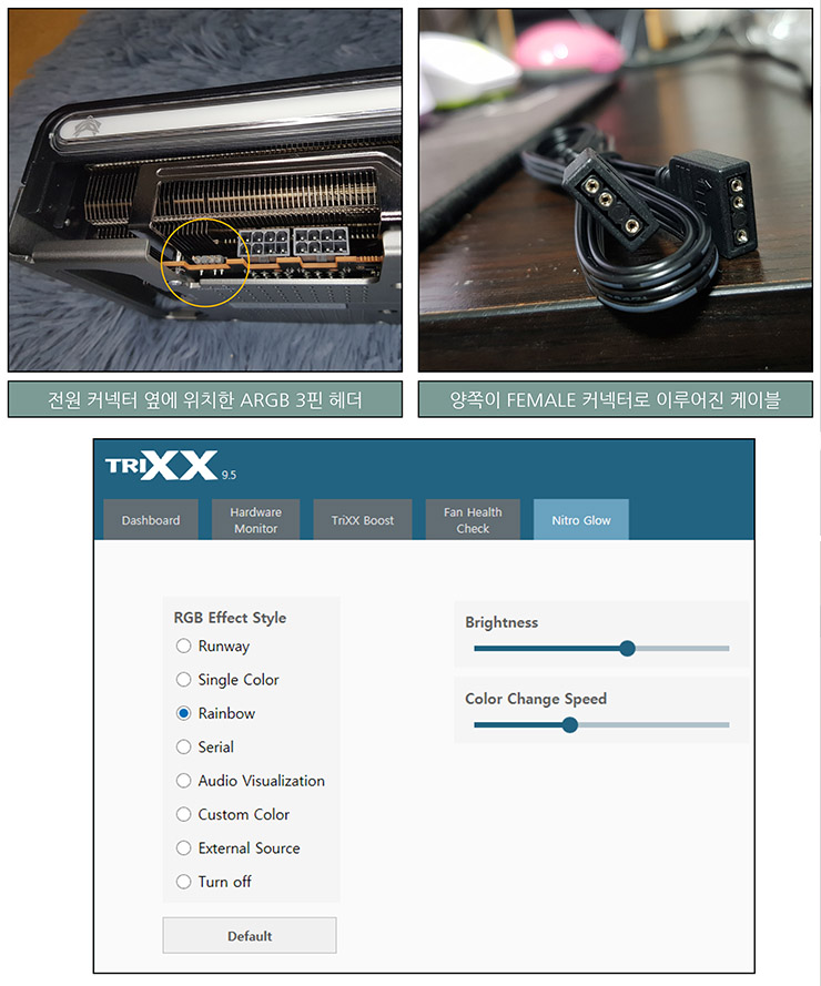 니트로 글로우는 메인보드 ARGB 기능과 연동할 수도 있다.  방법은 동봉된 ARGB 케이블 커넥터를 한쪽은 그래픽카드에, 다른 쪽은 메인보드에 각각 연결한 후 TriXX Nitro Glow 메뉴에서 External Source를 선택하는 것이다.